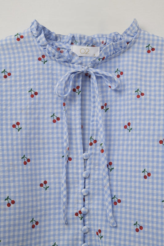 Blusa azul claro con detalles de cerezas y lazo anudado