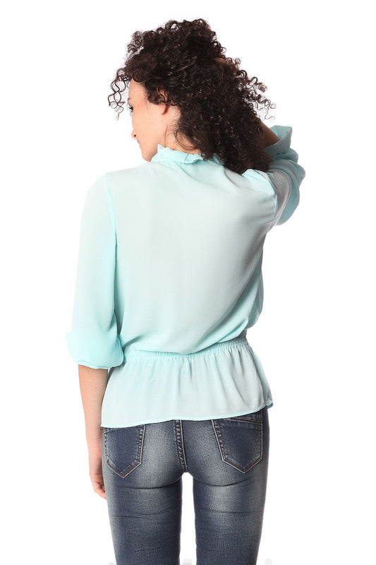 Blusa con cuello con volantes y lazada fina turquesa