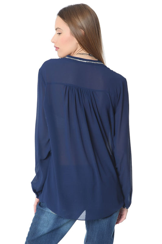 Blusa de chifón azul marino con adorno de cuentas plateadas