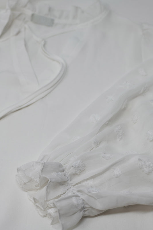 Blusa de gasa Blanca de Lunares en Manga Larga con Cuello en V