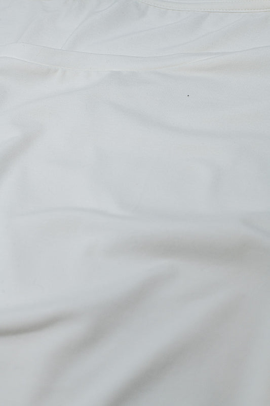 Camiseta crema con logotipos de nombres famosos en la parte delantera