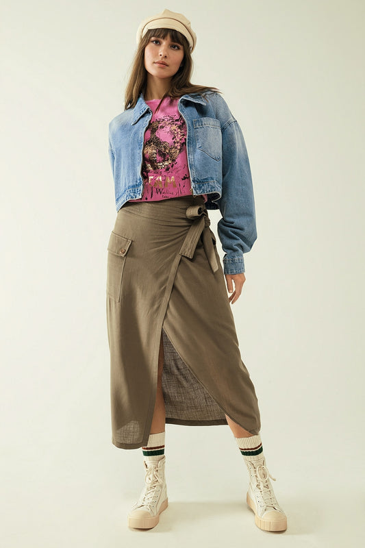 Camiseta caqui estampada Tie Dye con nudo en la parte delantera