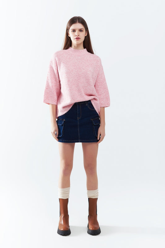 Suéter rosa mullido con mangas tres cuartos y cuello redondo