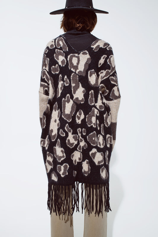 Cárdigan largo abierto con estampado de guepardo y flecos en negro y gris