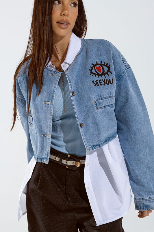 Cazadora vaquera recortada con estampado pintado a mano delante y detrás