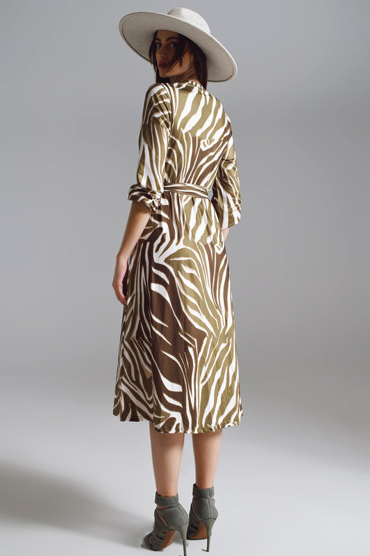 Vestido cruzado midi con cinturón en estampado de cebra en color verde oliva y crema