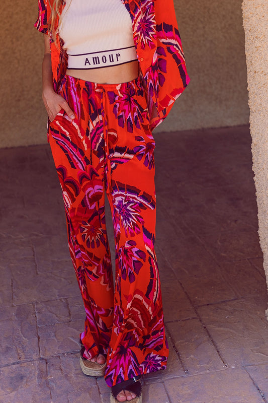 Pantalones estilo palazzo con estampado floral abstracto en naranja