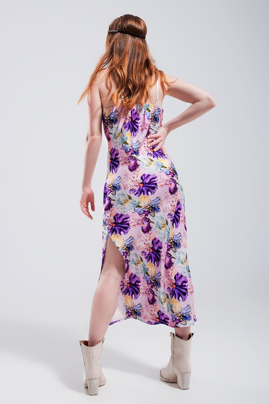 Vestido de tirantes con estampado floral variado de satén morado