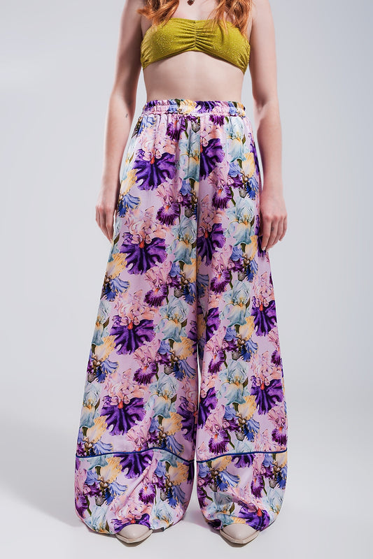 Pantalones de pernera ancha y talle alto con estampado floral morado de satén