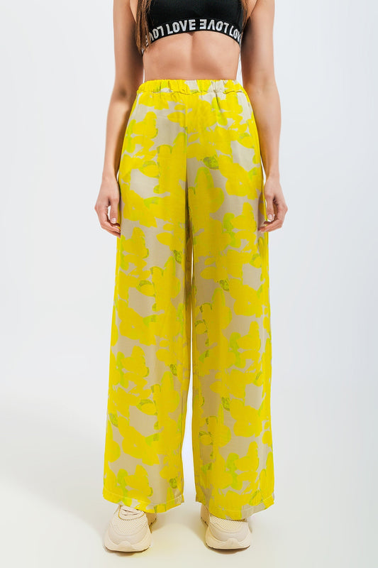Pantalones de pernera ancha con estampado floral amarillo