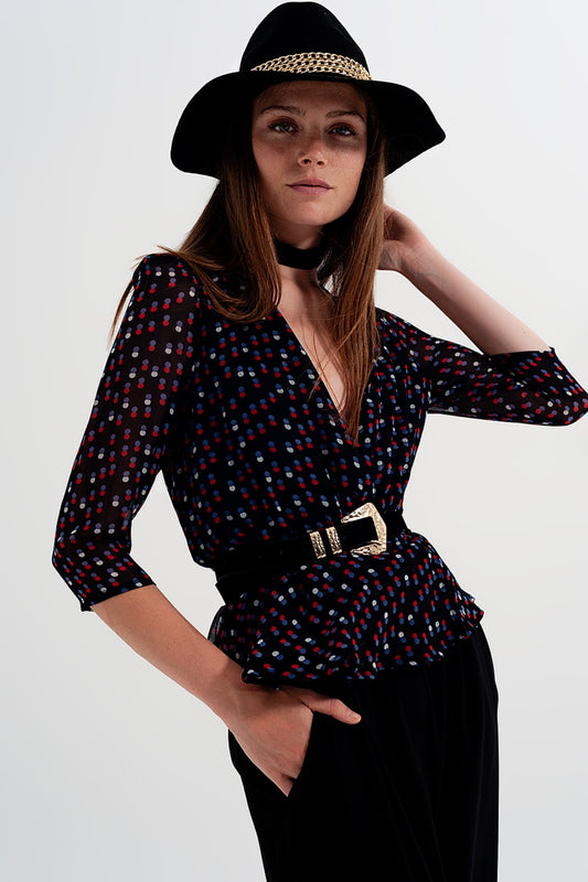 Top de gasa negro con diseño cruzado y estampado de lunares