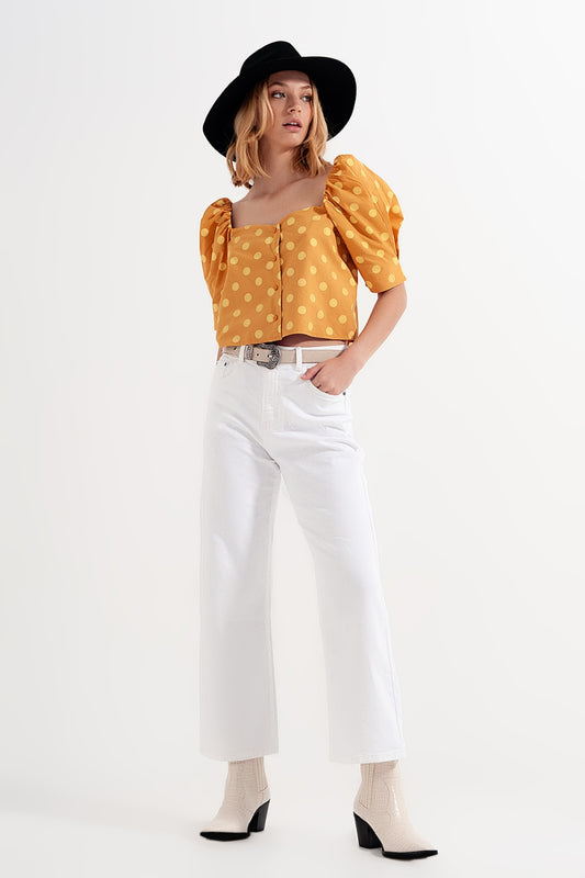 Top con escote cuadrado mangas abullonadas y estampado de lunares amarillo
