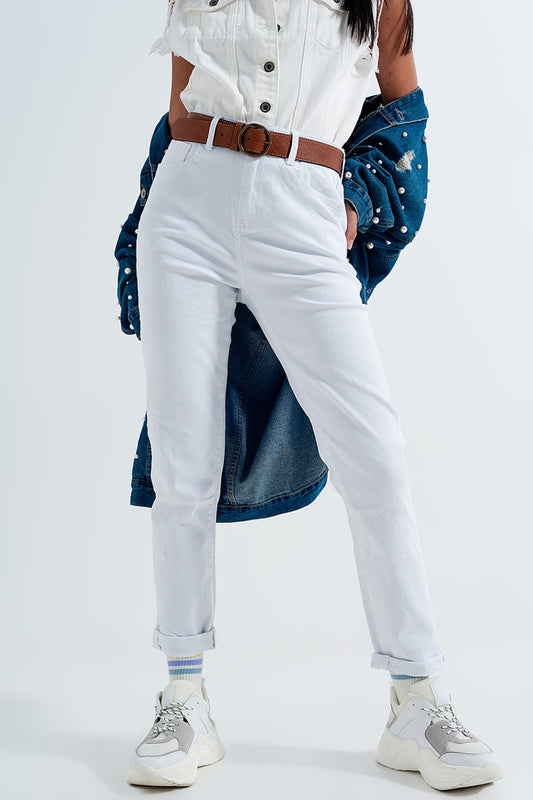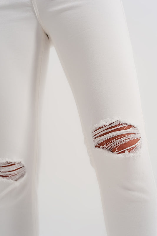 Vaqueros crema con bajos deshilachados y detalles rasgados