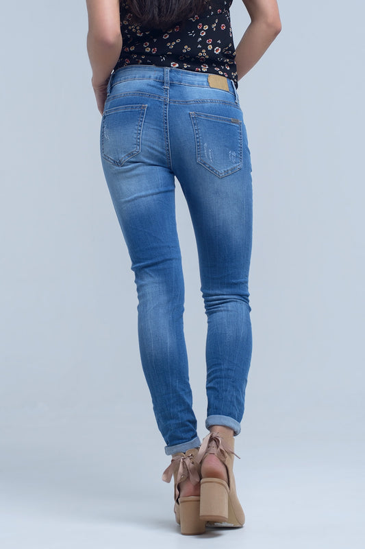 Jeans pitillo en lavado medio con rotos en las rodillas