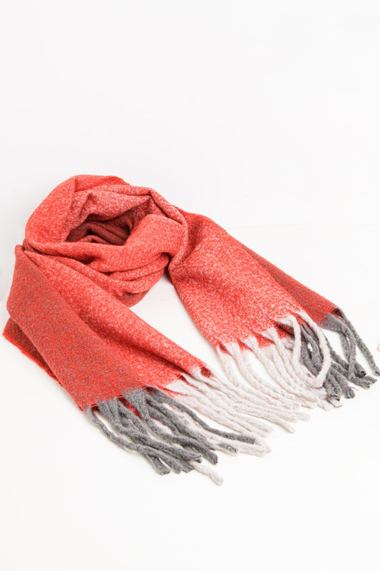 Bufanda de punto grueso en bloque de color rojo con flecos