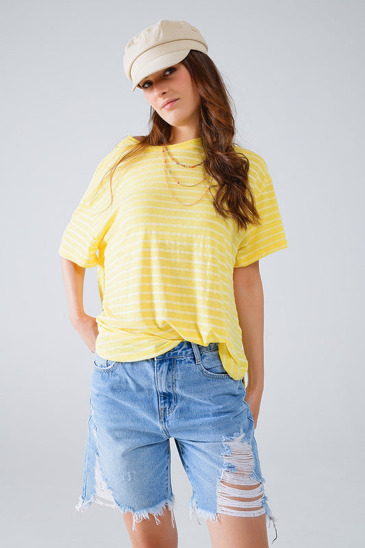 Camiseta relajada de rayas con cuello redondo en amarillo