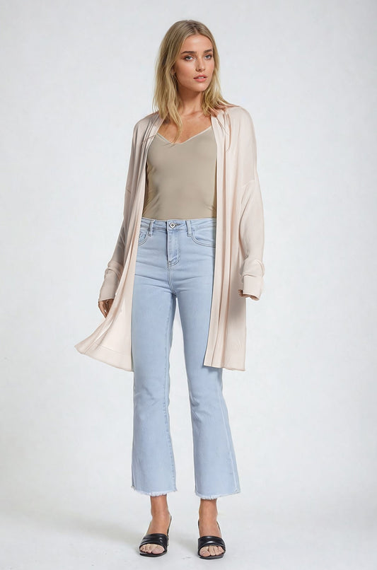 Cárdigan blanco abierto con extremos de flecos y mangas 3/4