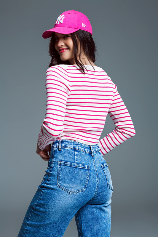 Slim Fit Suéter De Punto Fino Con Cuello Barco En Blanco Con Rayas Fucsia