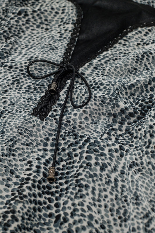 Vestido a media pierna con estampado floral azul y aplicaciones de croché
