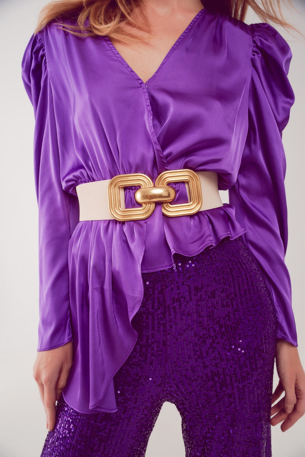 Blusa asimétrica con mangas abullonadas en morado