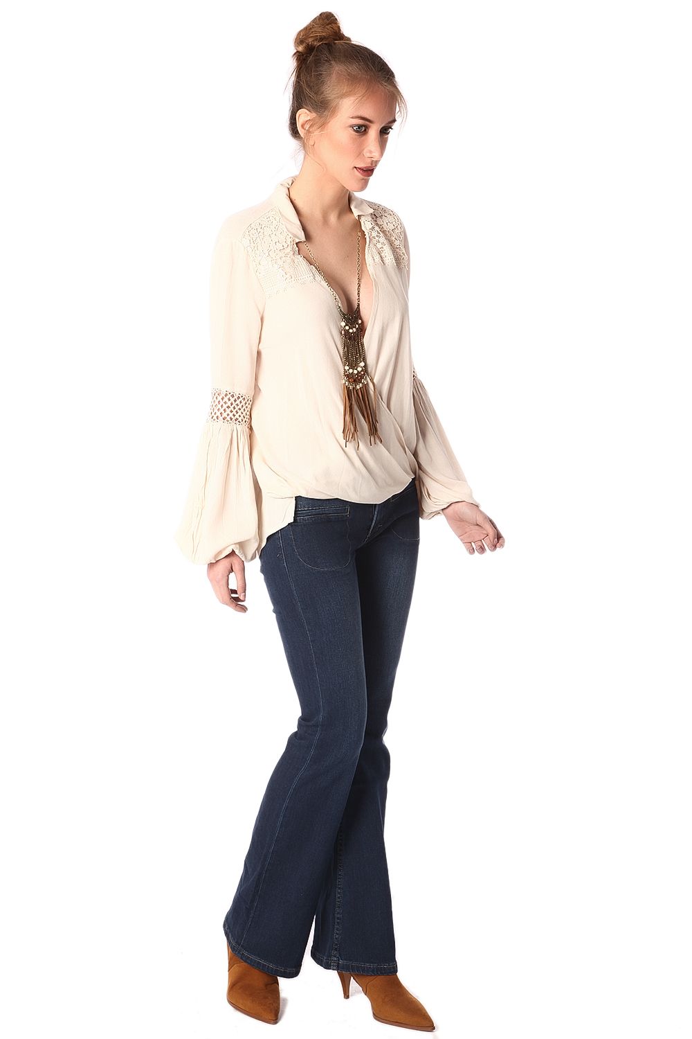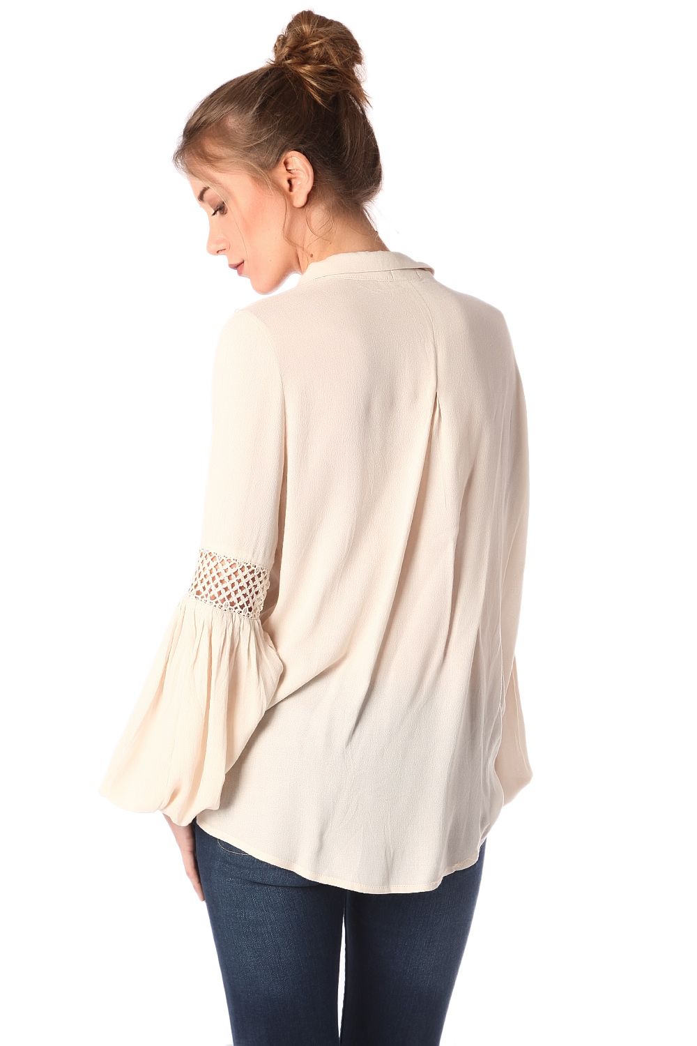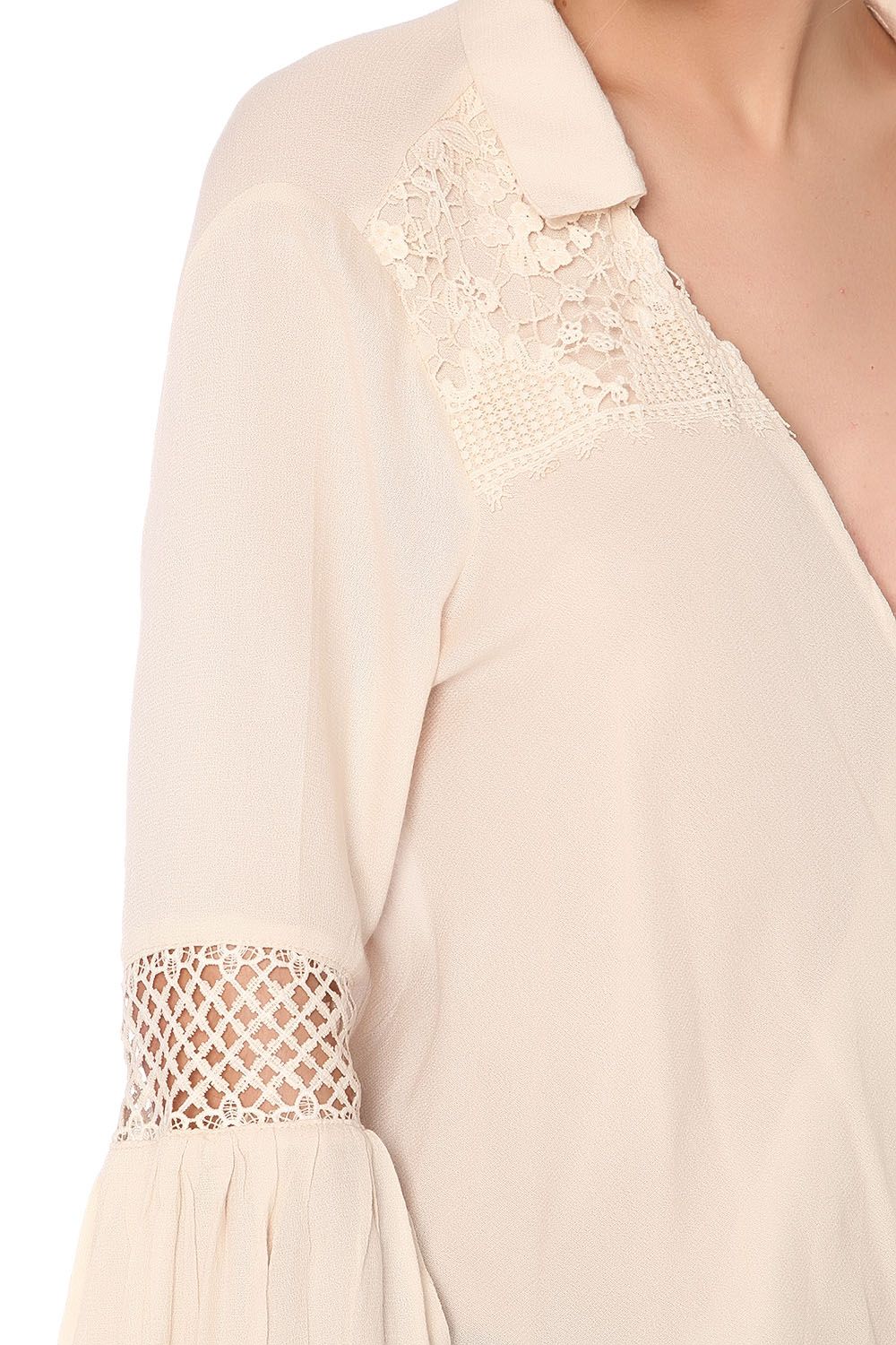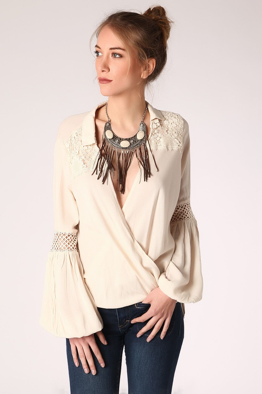 Blusa beige con parte delantera cruzada y detalle drapeado