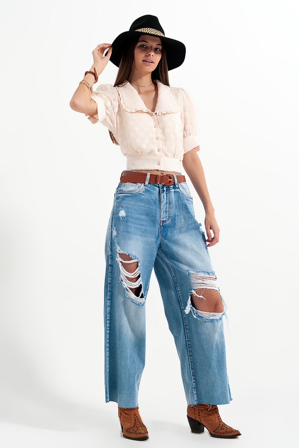 Blusa beige de lunares con cuello estilo babero y botones decorativos