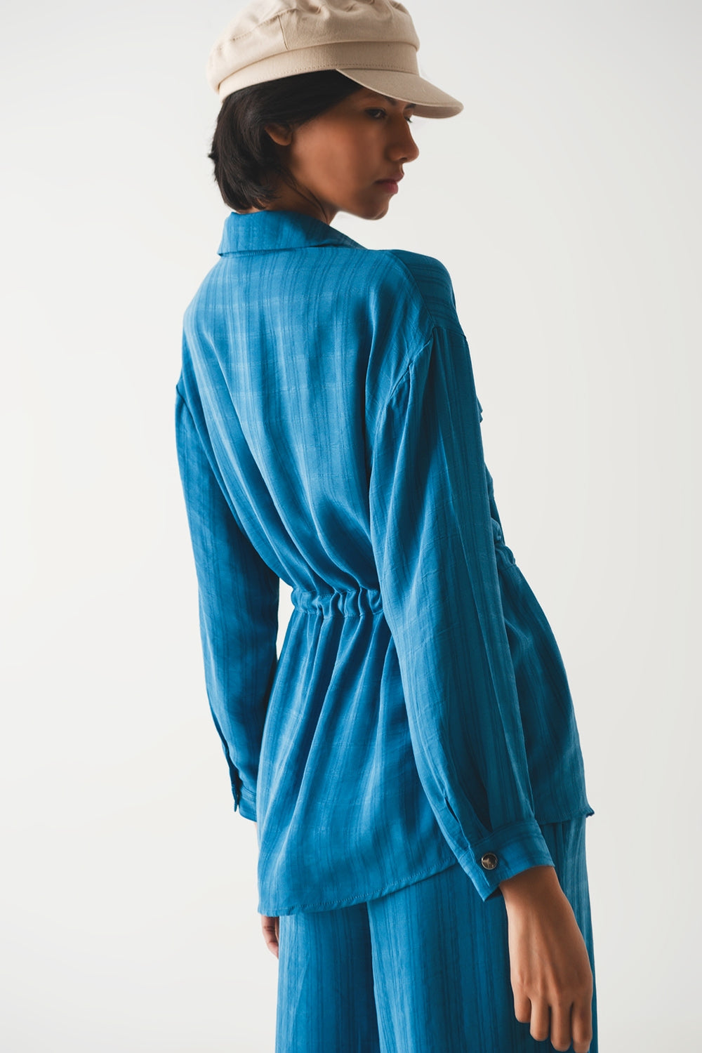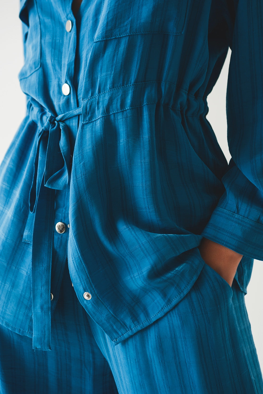 Camisa azul de manga larga con lazada en la cintura