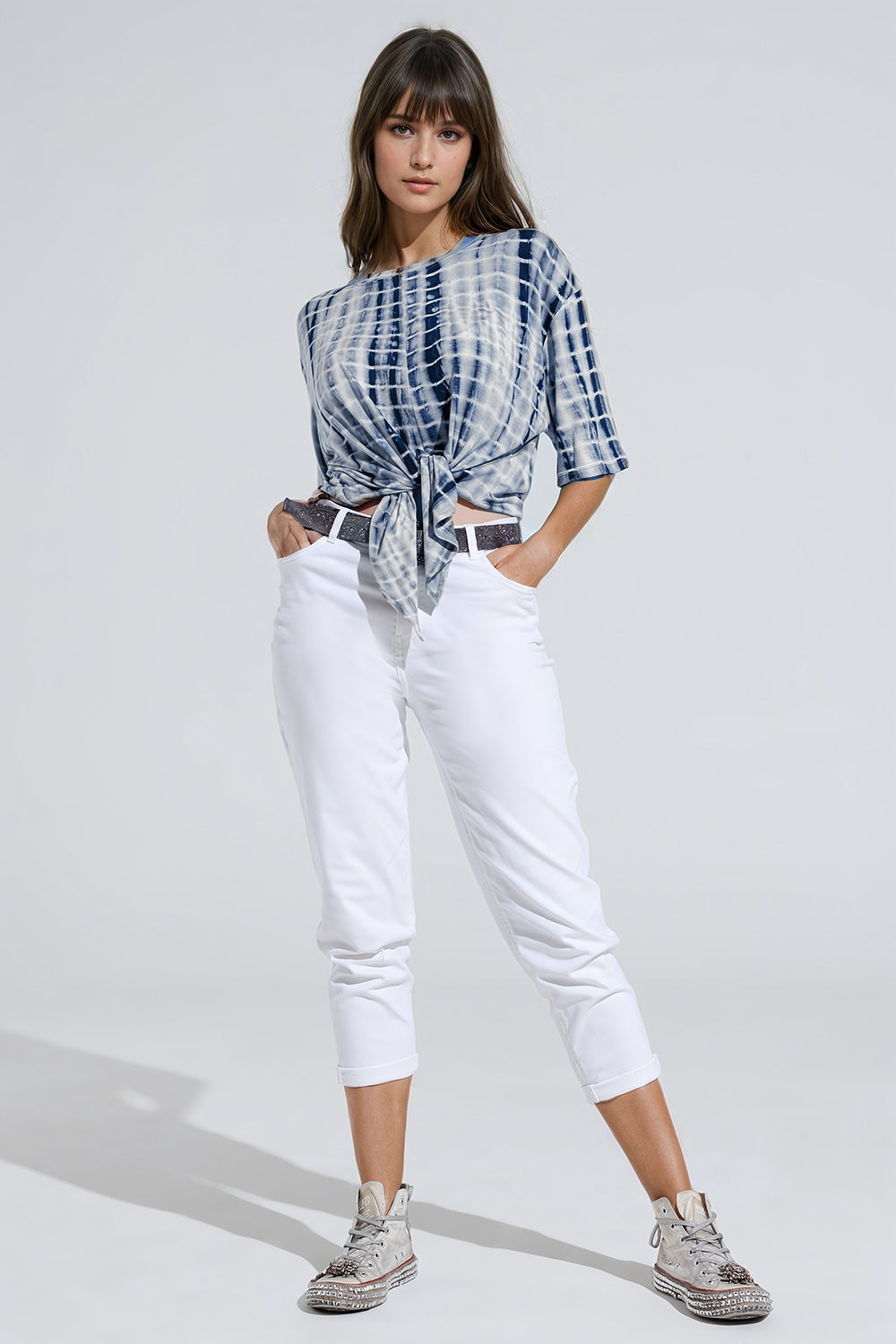 Camiseta estampada Tie Dye azul con nudo en la parte delantera