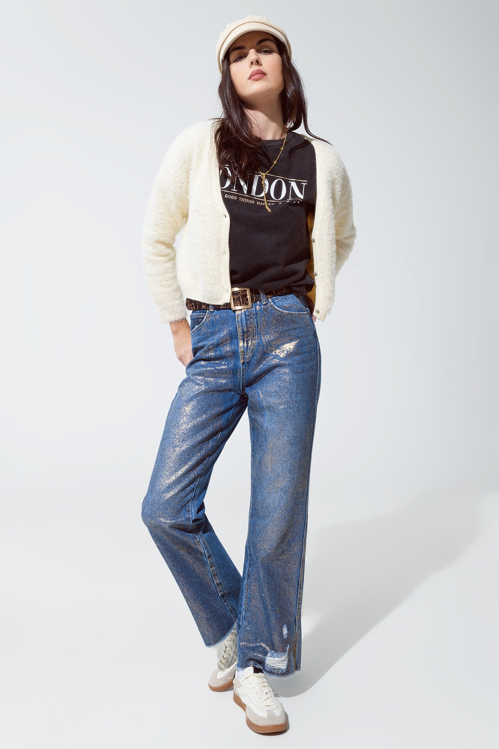 Cárdigan en crudo esponjoso con fondo plateado