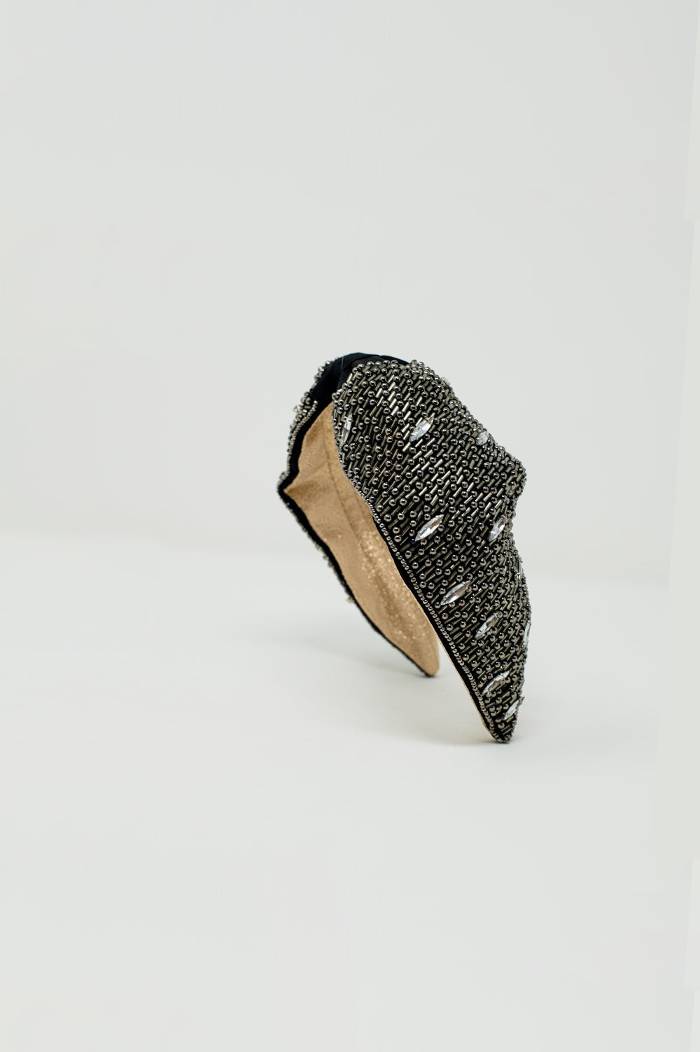 Diadema con decoraciones de cuentas metálicas y ornamentos de cristal