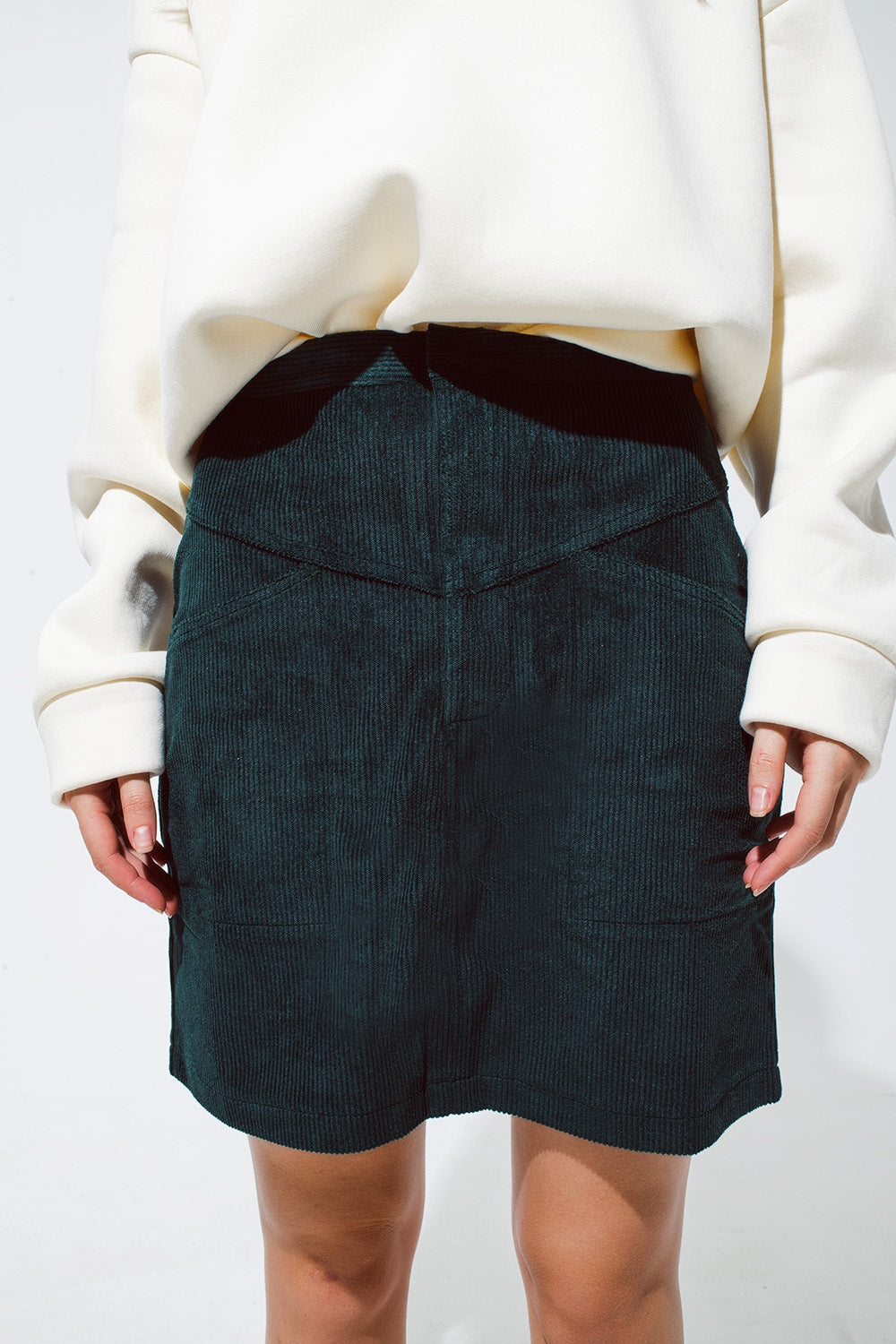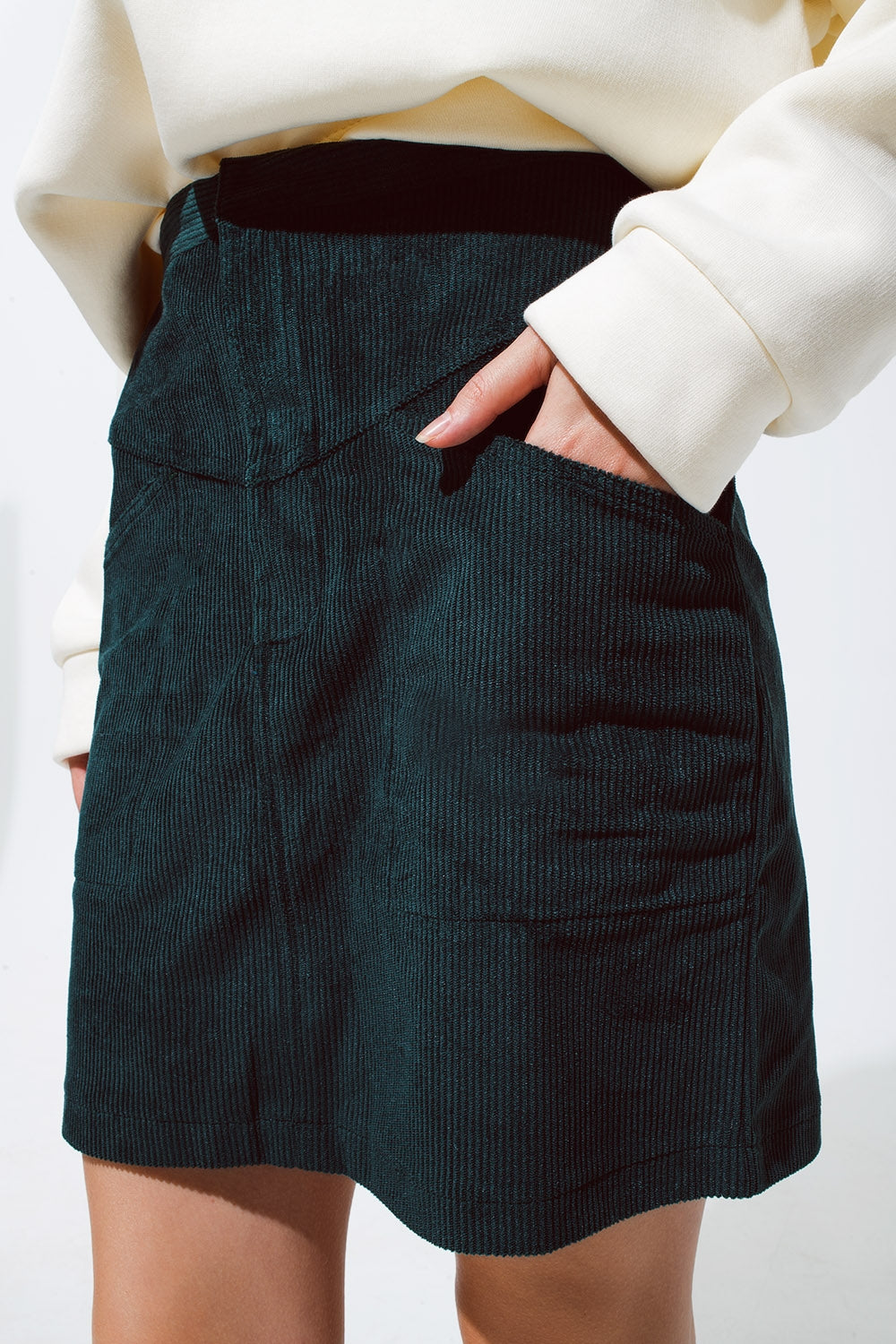 falda corta de pana verde con bolsillos