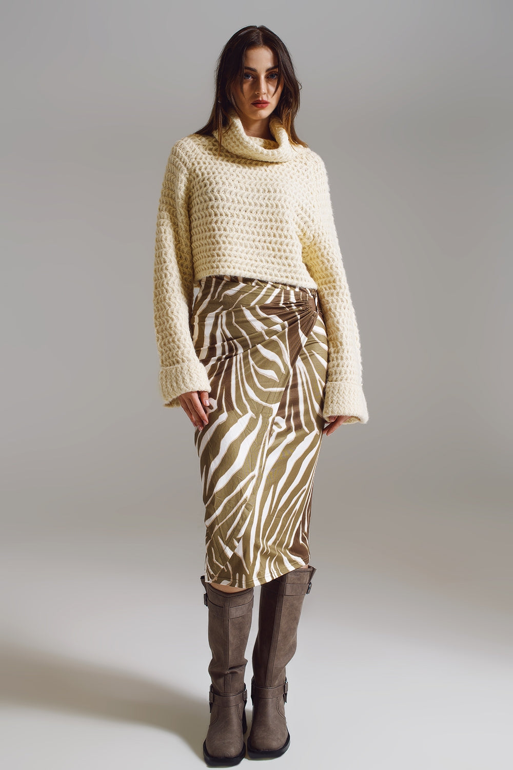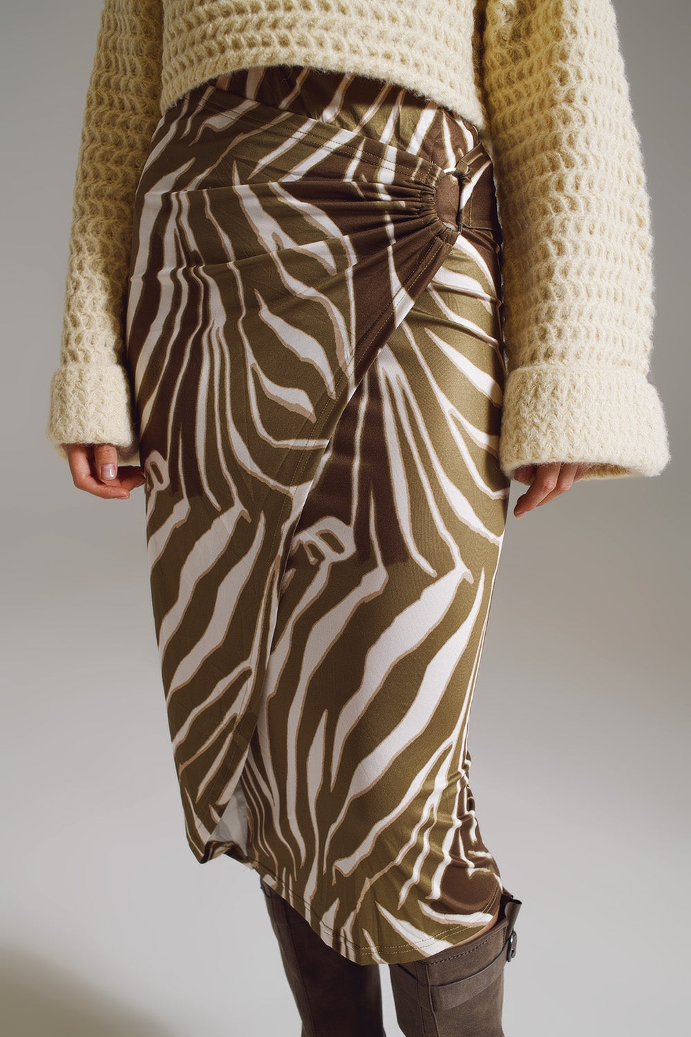 Falda envolvente con detalle fruncido en el lateral en estampado cebra verde oliva y crema