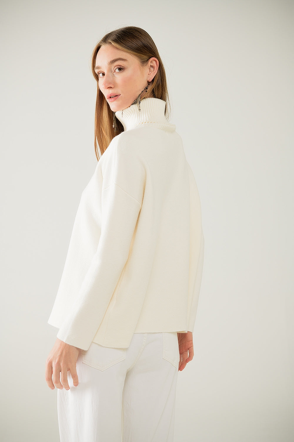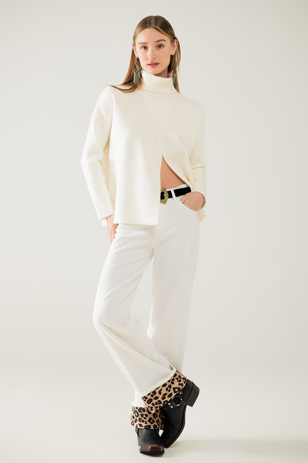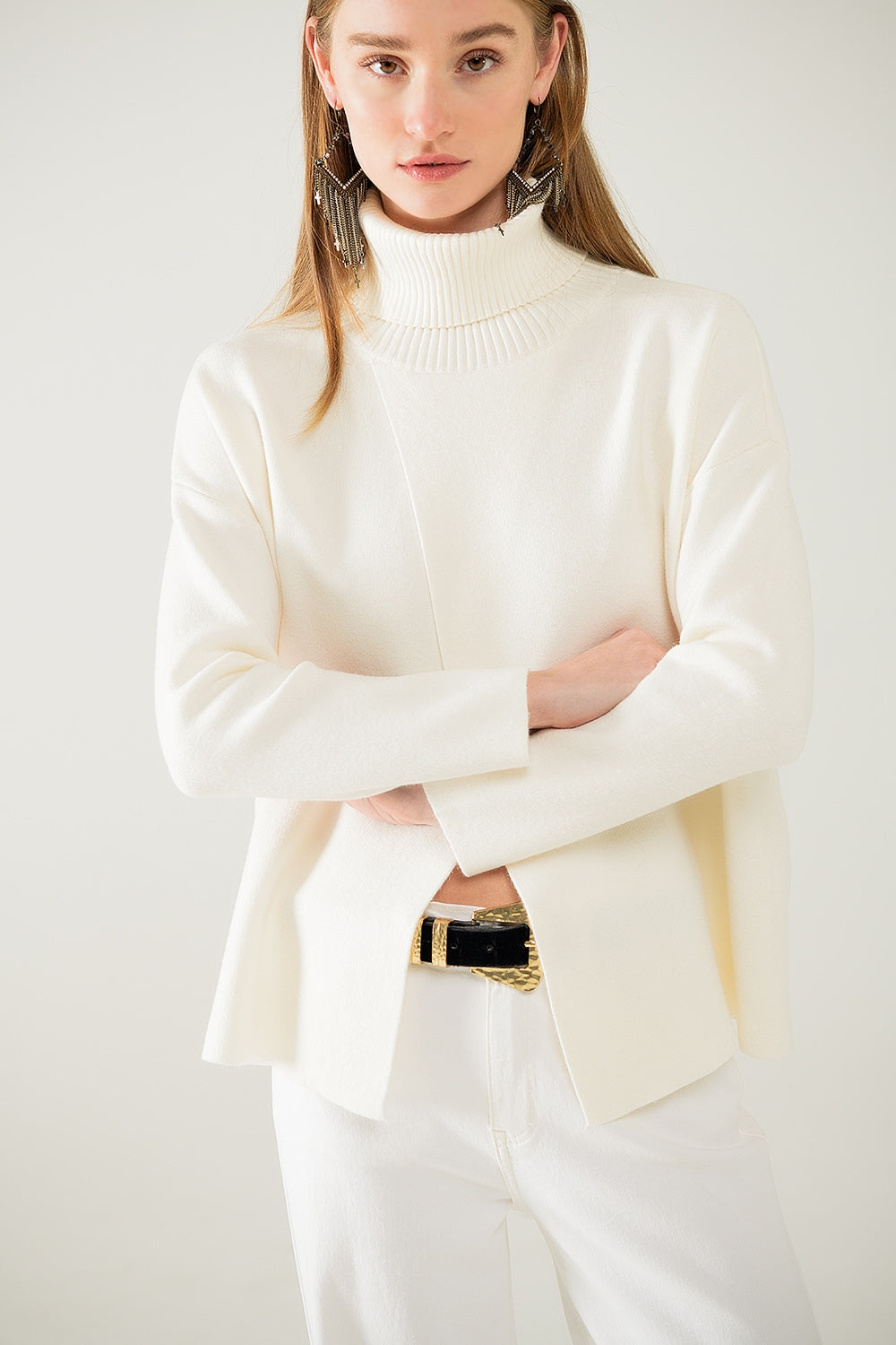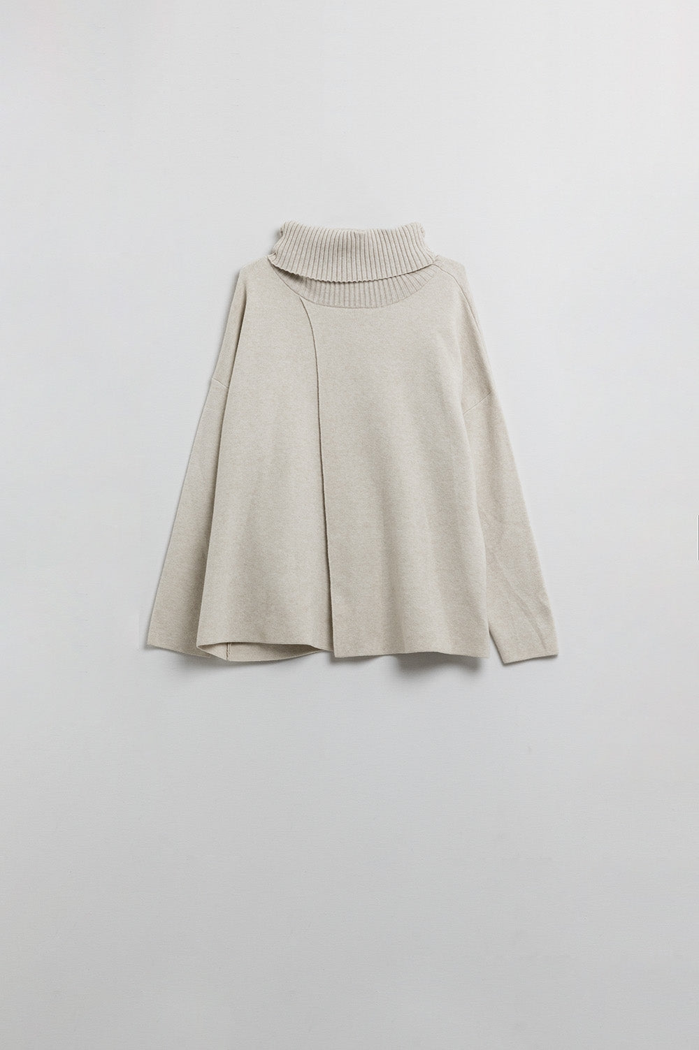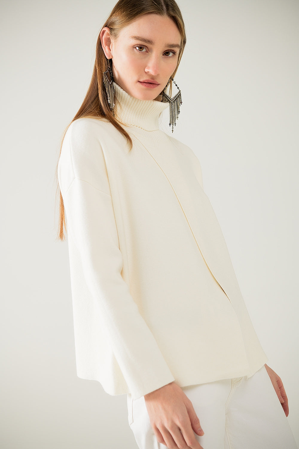 Jersey de cuello alto de punto suave color crema con abertura delantera