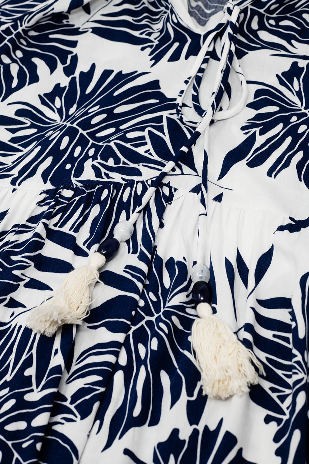 Maxivestido boho con mangas globo y estampado de hojas en blanco y azul marino