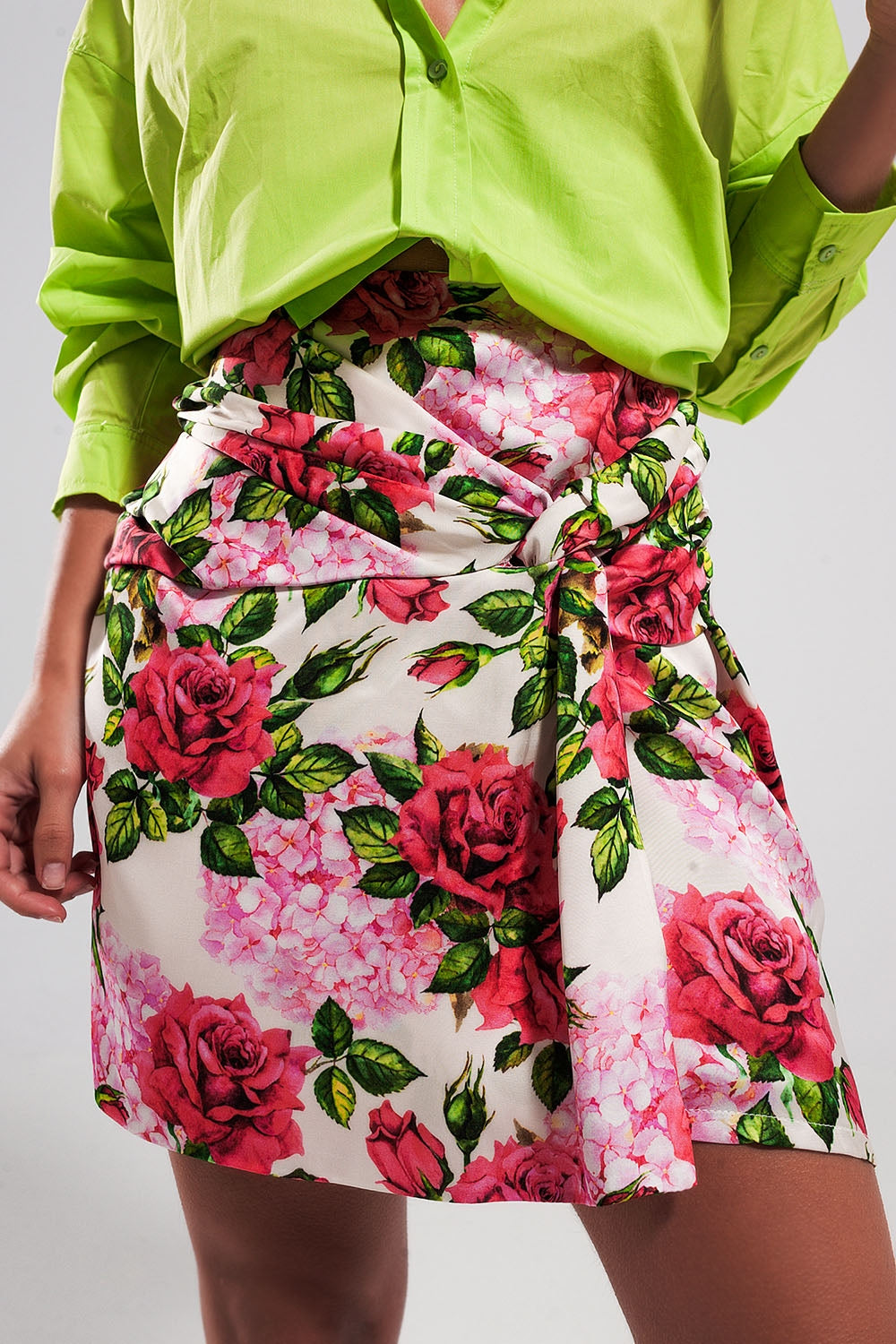 Mini Falda con estampado de rosas y nudo en la parte delantera