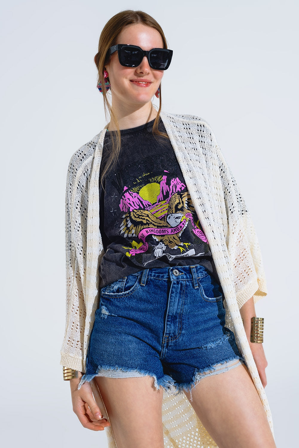Poncho Crema Estilo Boho Con Punto Pointelle A Rayas Y Detalles De Flecos