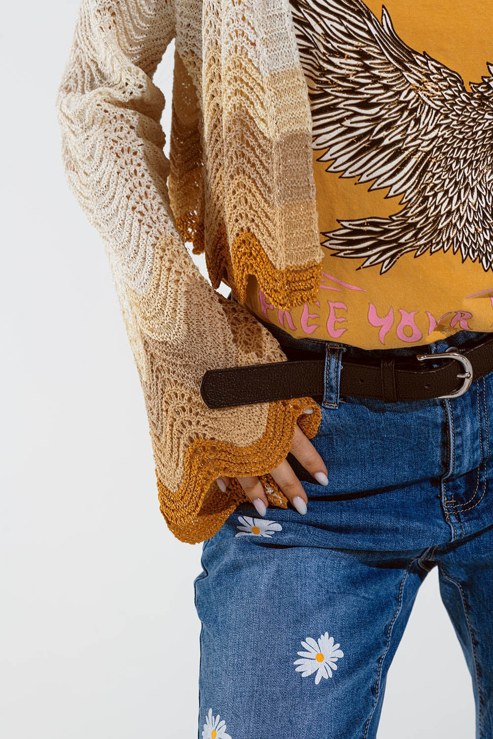 Rebeca corta de punto con mangas de ángel y detalle ondulado multicolor en beige