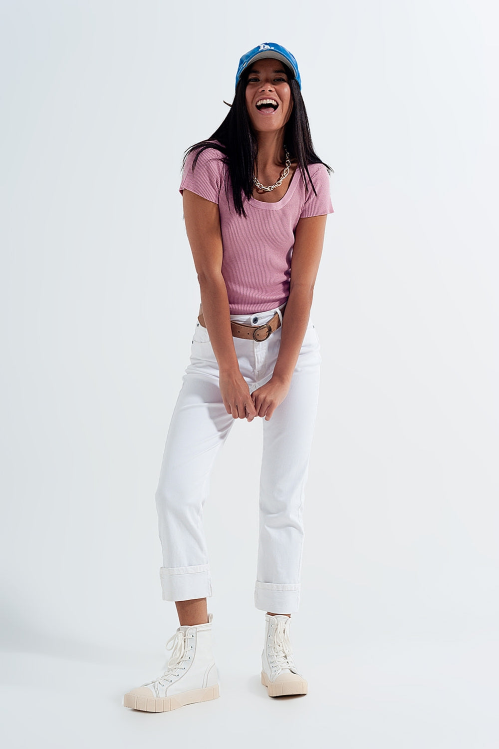 Sueter ajustada de punto de canalé con cuello redondo en rosa
