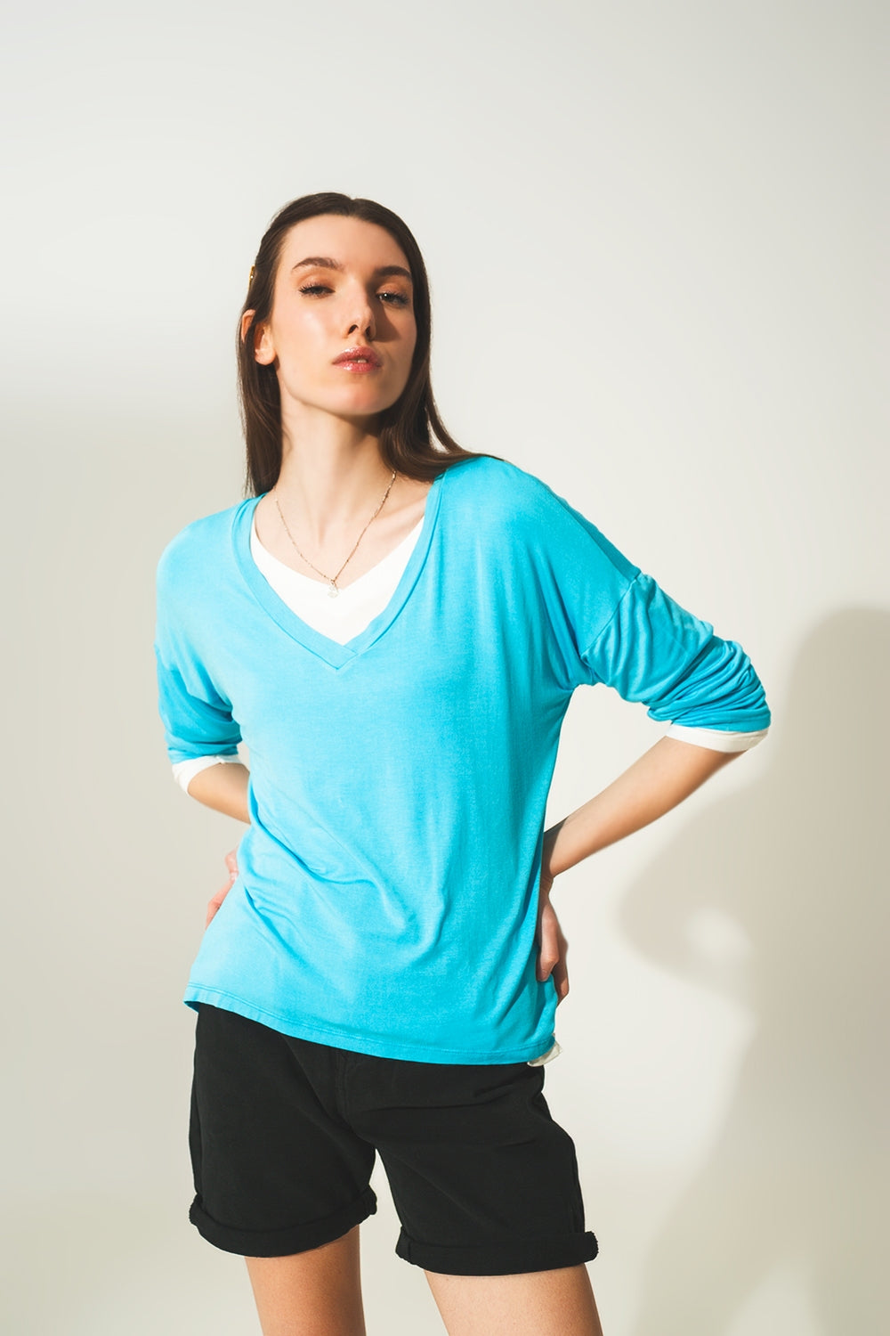 Top azul de modal manga larga y cuello de pico