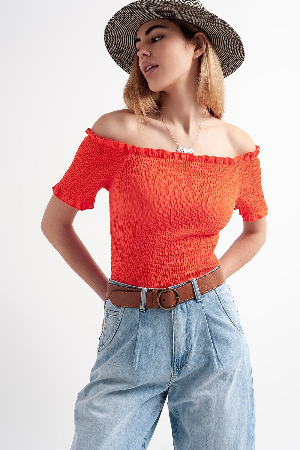 Top corto naranja con diseño fruncido y escote Bardot