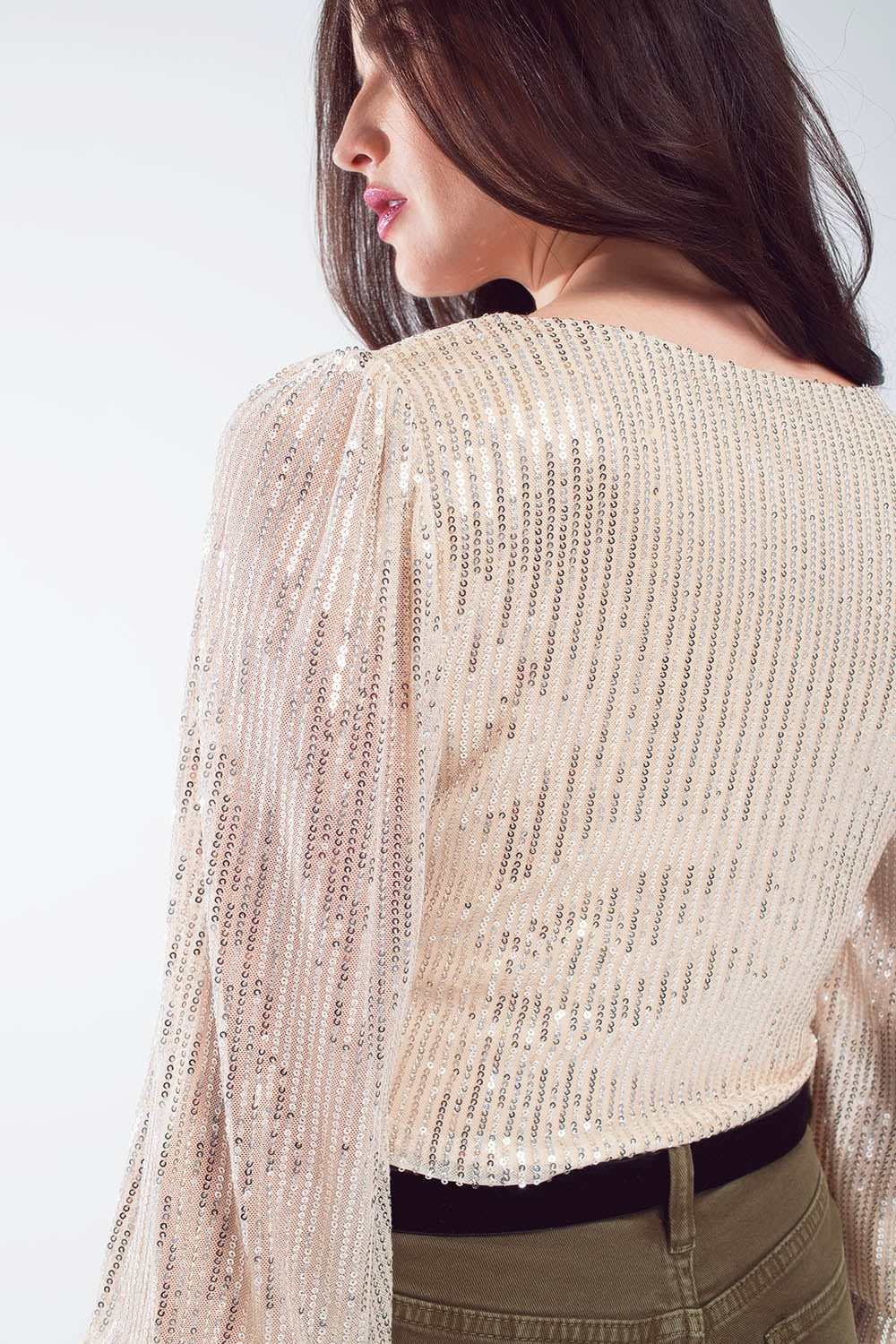 Top de lentejuelas de manga larga con escote en V y diseño de pliegues en blanco perla