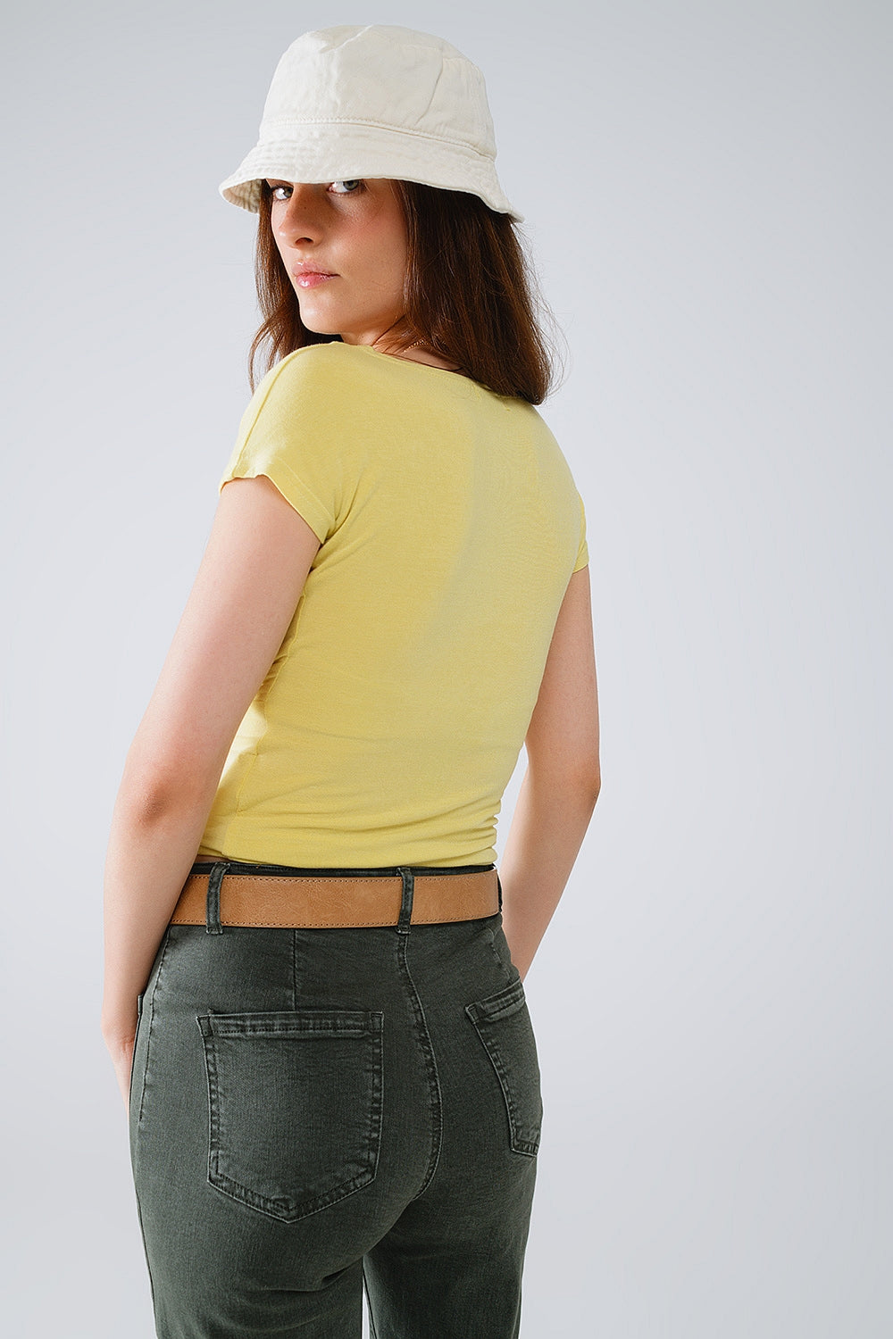 Top entallado con cuello de pico y mangas casquillo en color lima claro