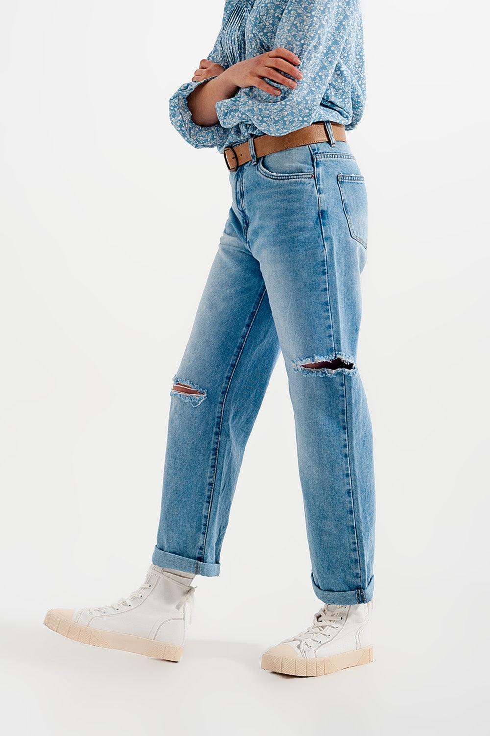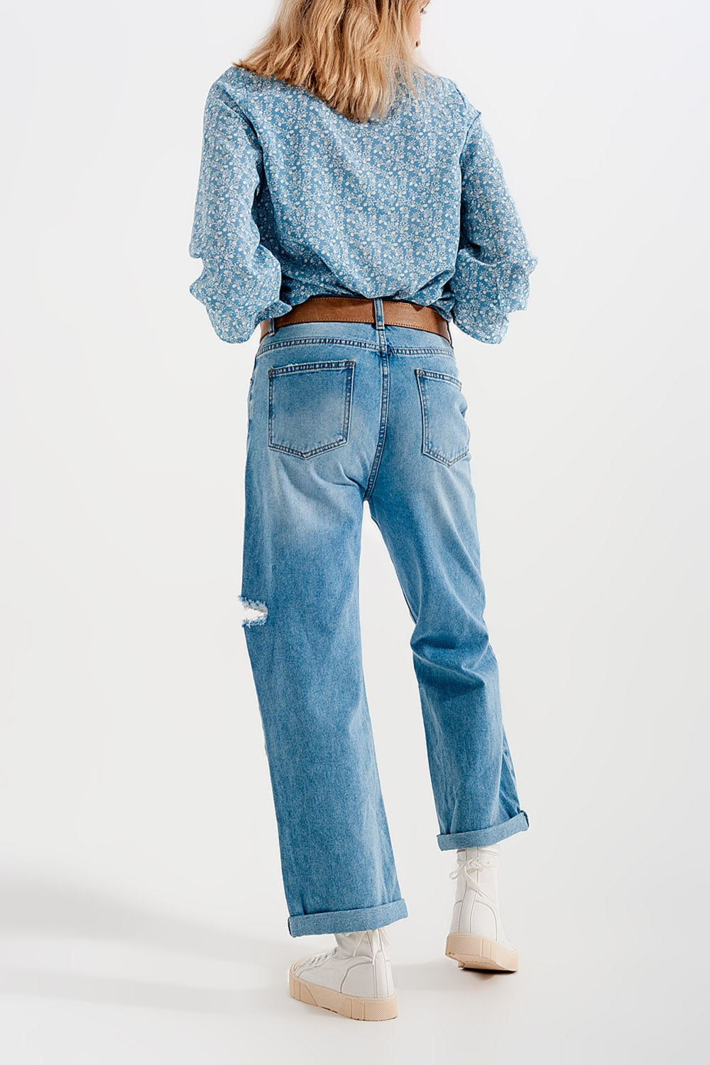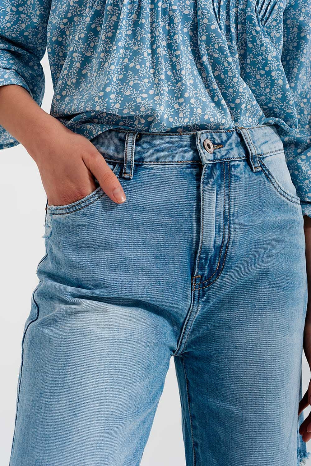 Vaquero de pierna ancha con rasgaduras en las rodillas de color azul lavado