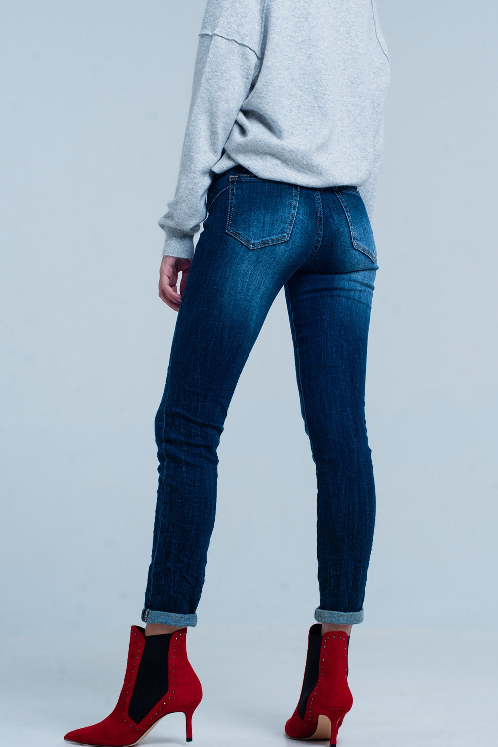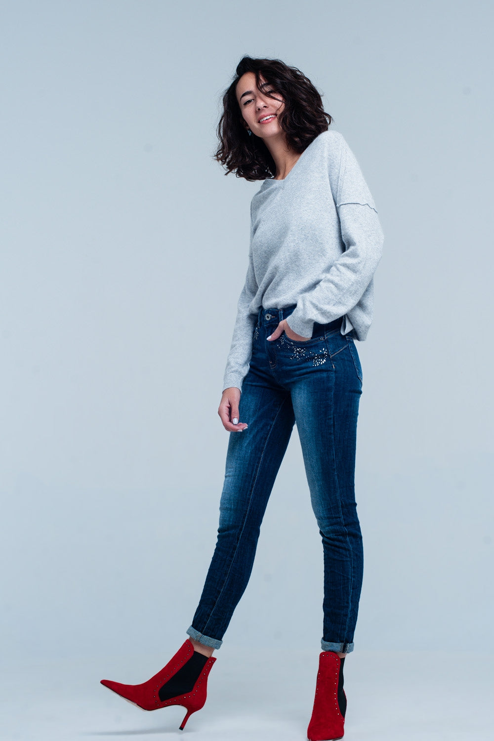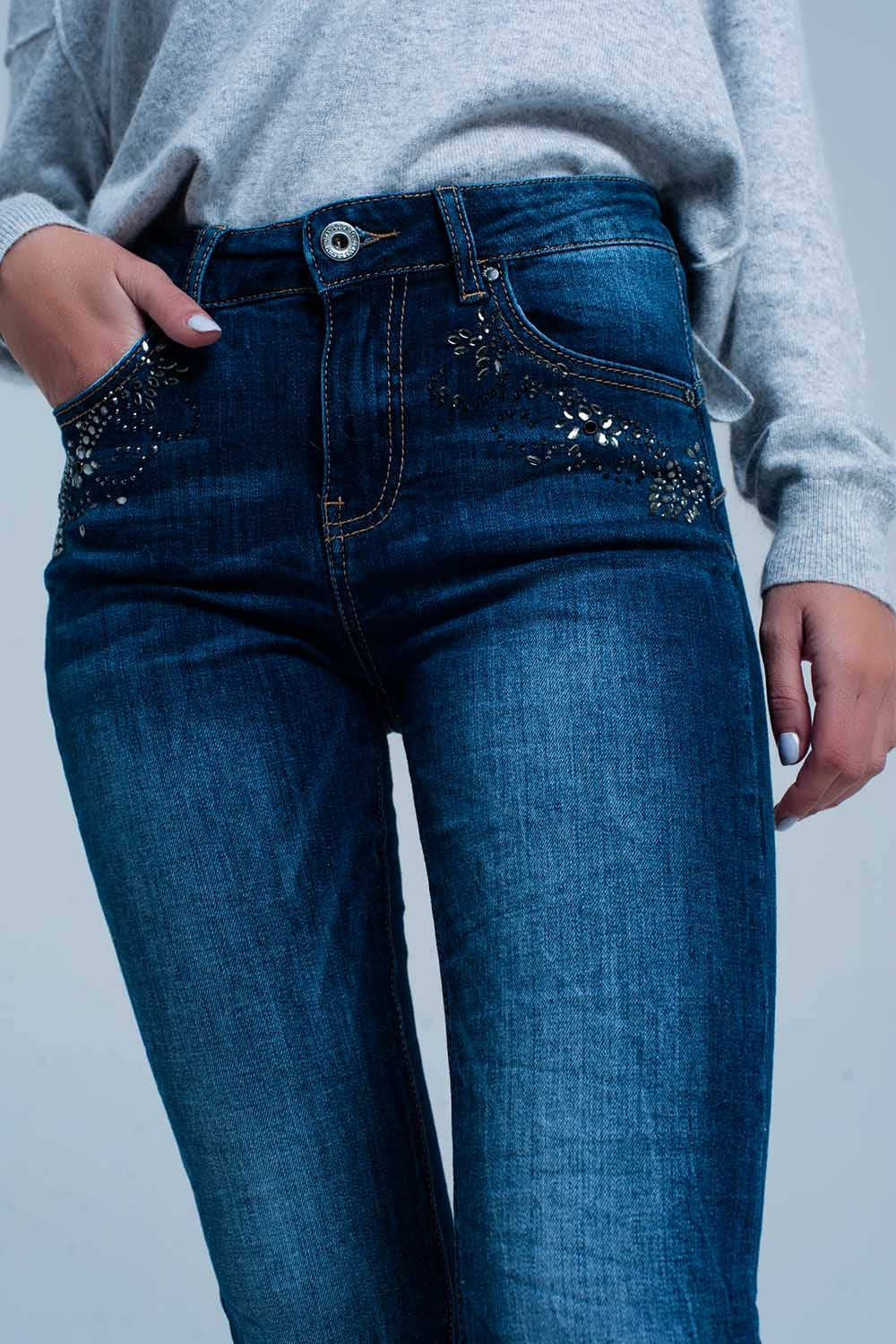 Vaquero de tiro alto con lavado oscuro con detalles de strass