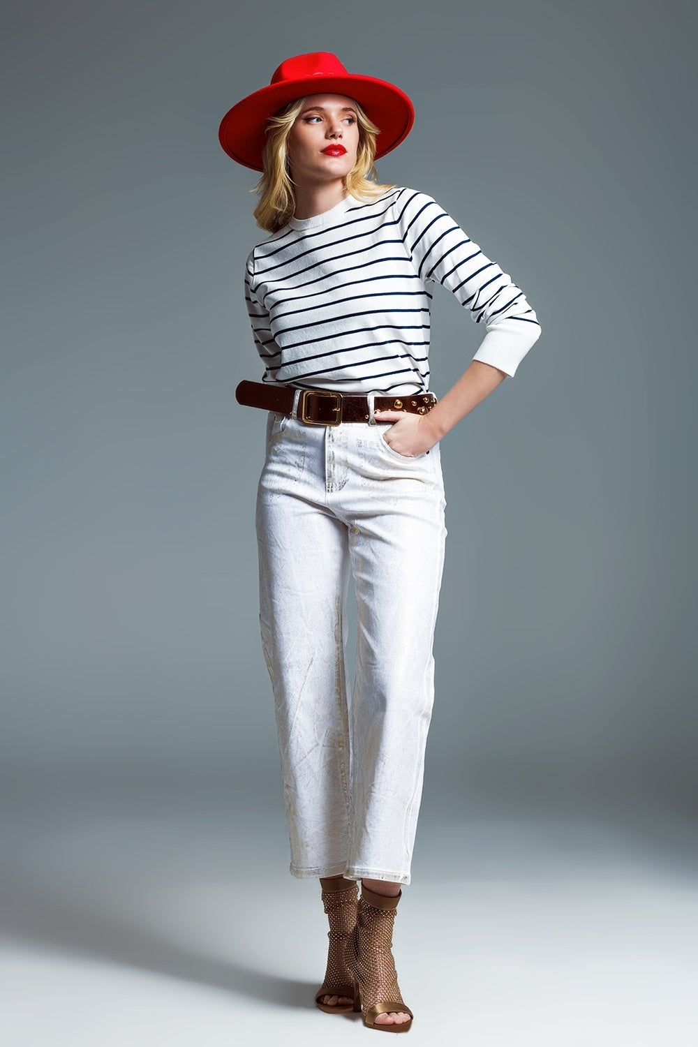 Vaqueros blancos de pata ancha con acabado metalizado en dorado
