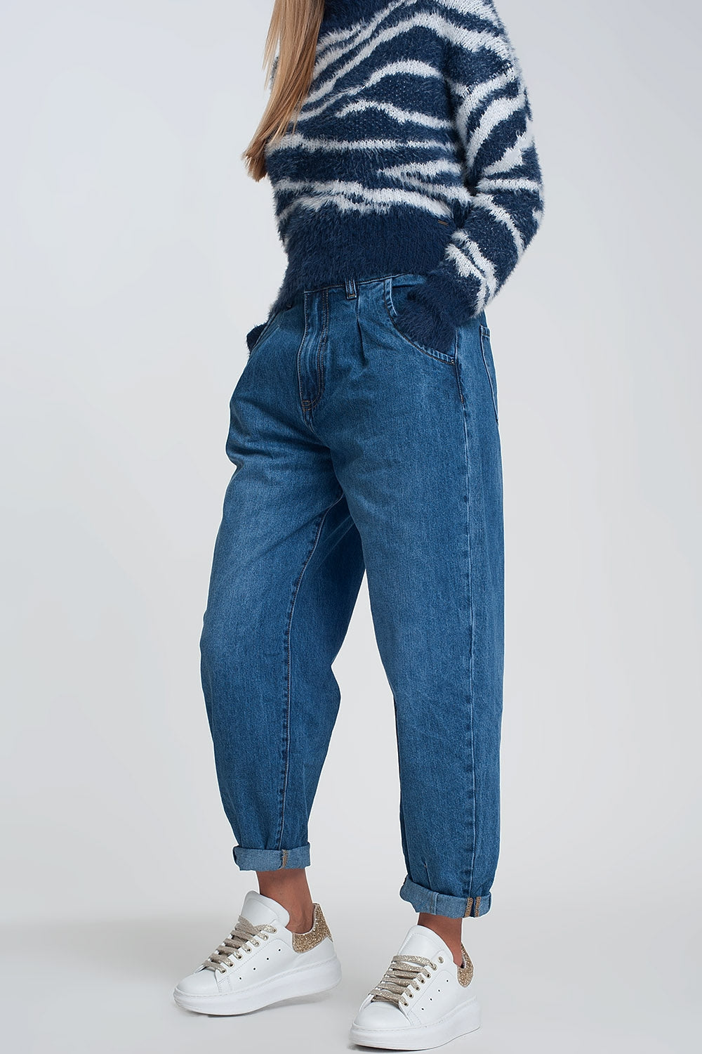 Vaqueros mom de talle alto con dos volantes en la cintura en azul lavado oscuro