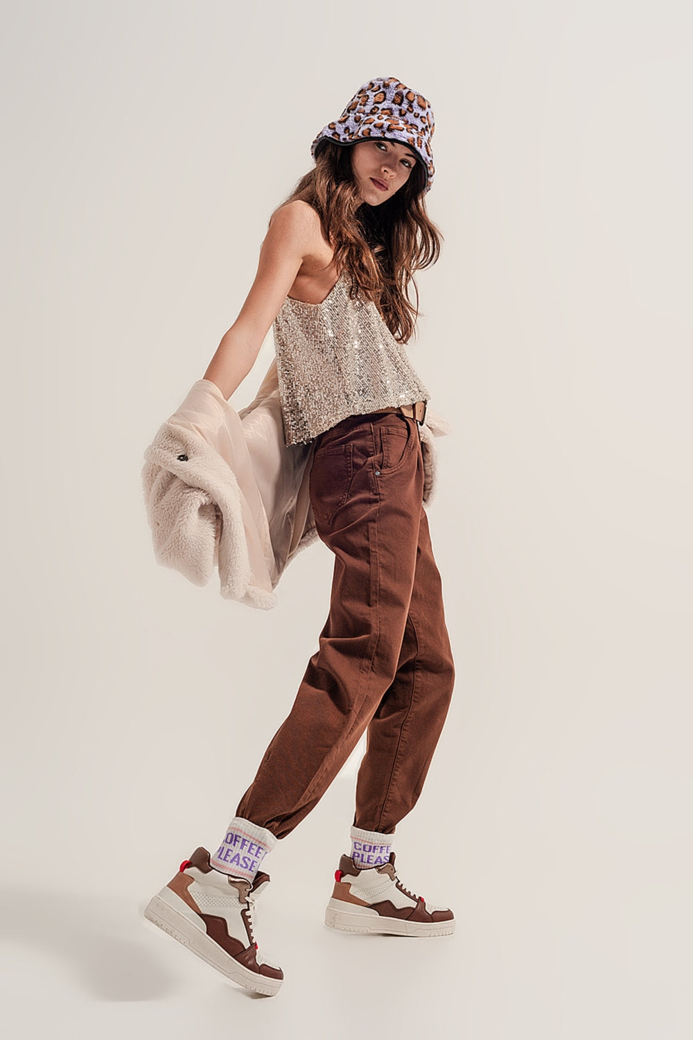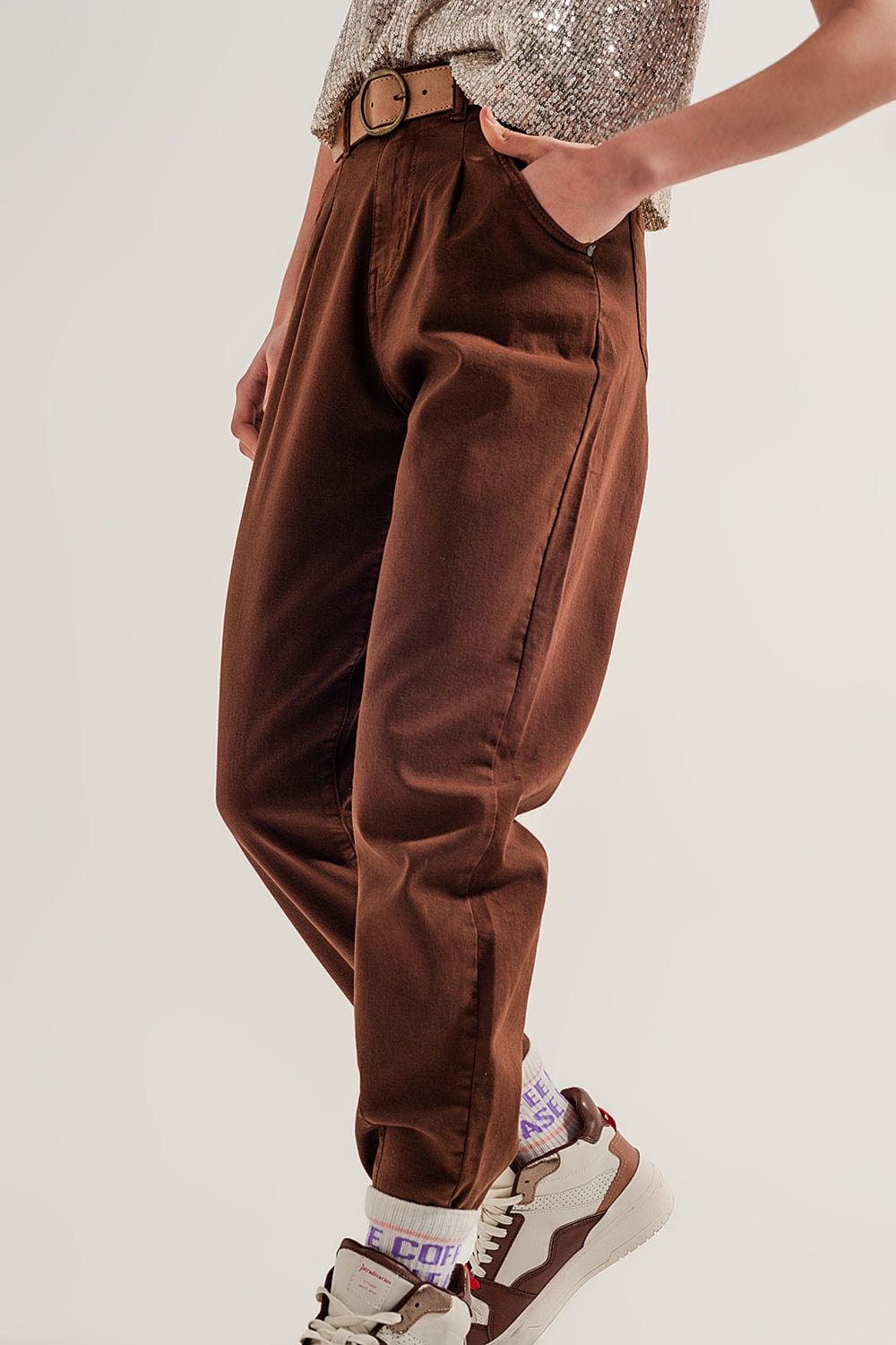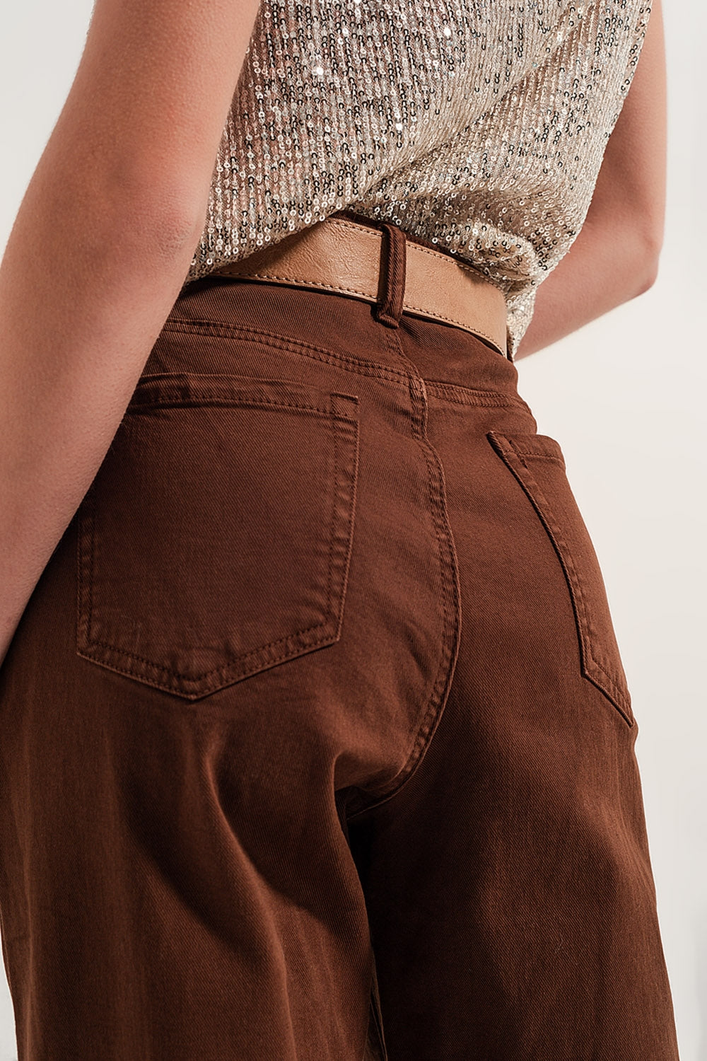 Vaqueros mom en color marron de talle alto con pinzas en la parte delantera