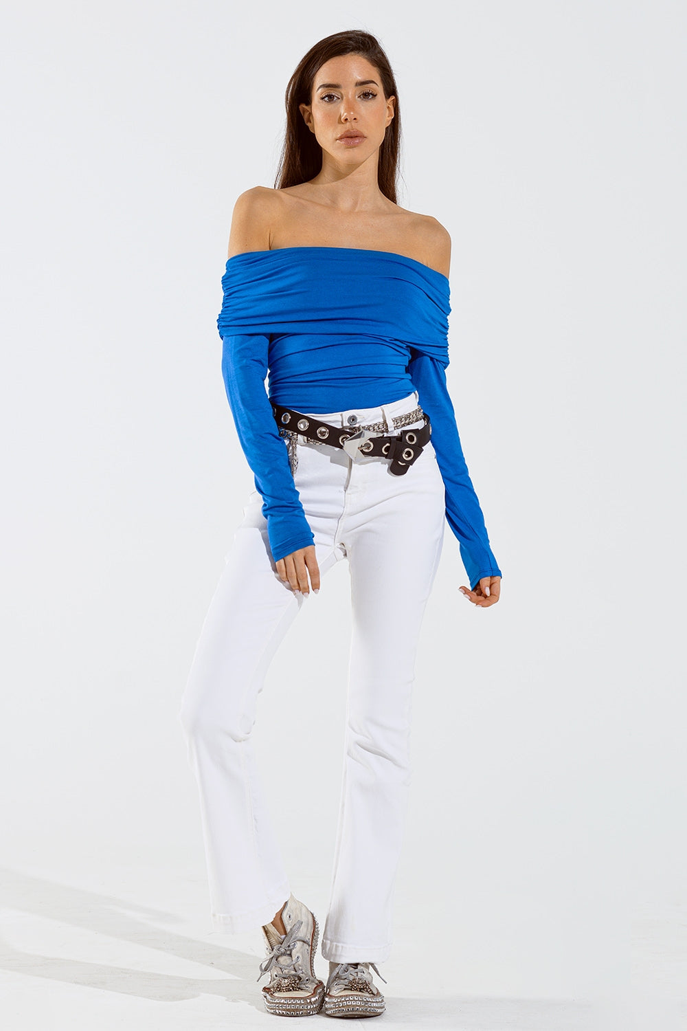 Vaqueros pitillo acampanados con detalle de doble botón en blanco