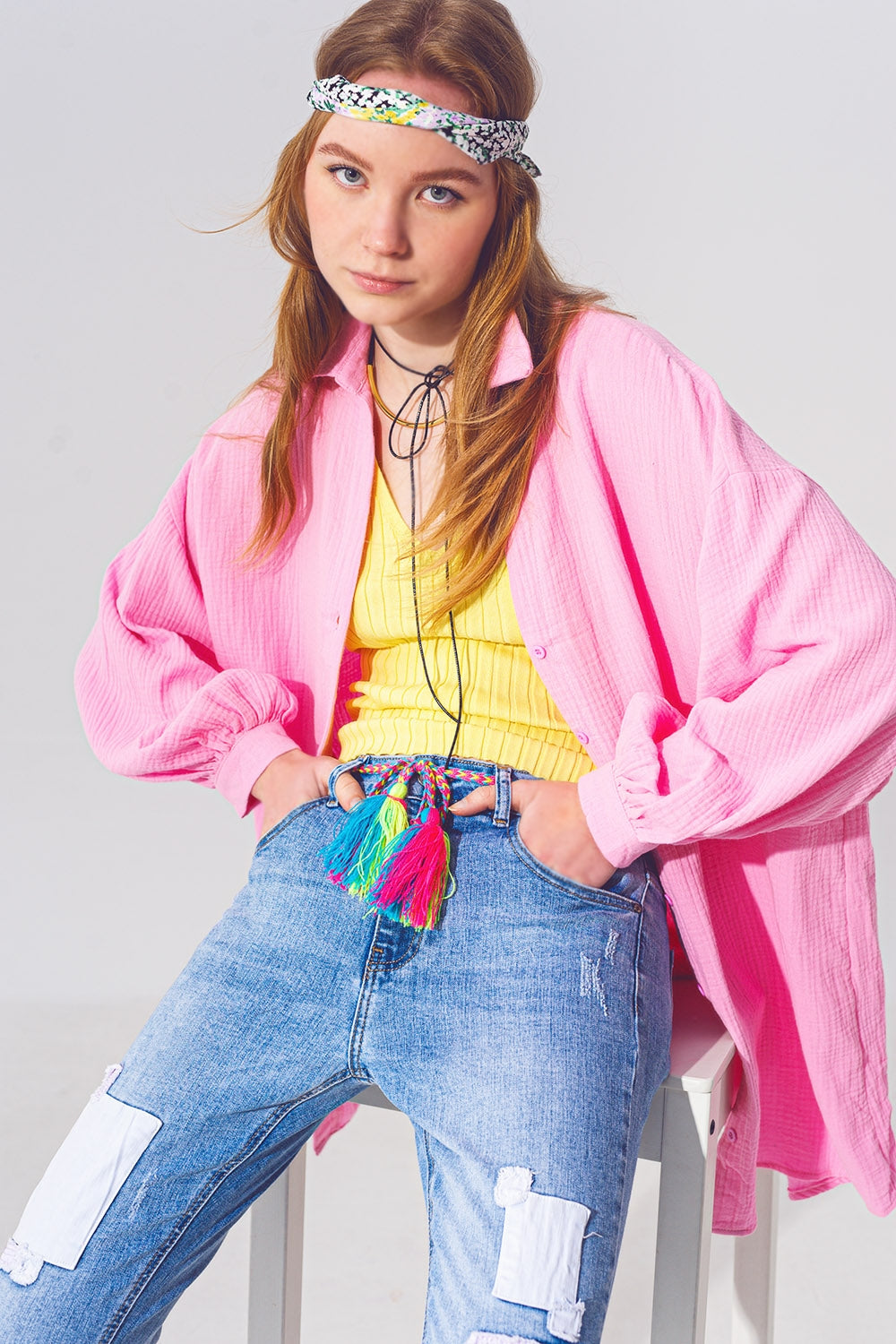 Vaqueros Pitillo Elásticos con Parches en Lavado Medio y Detalle de Cinturón