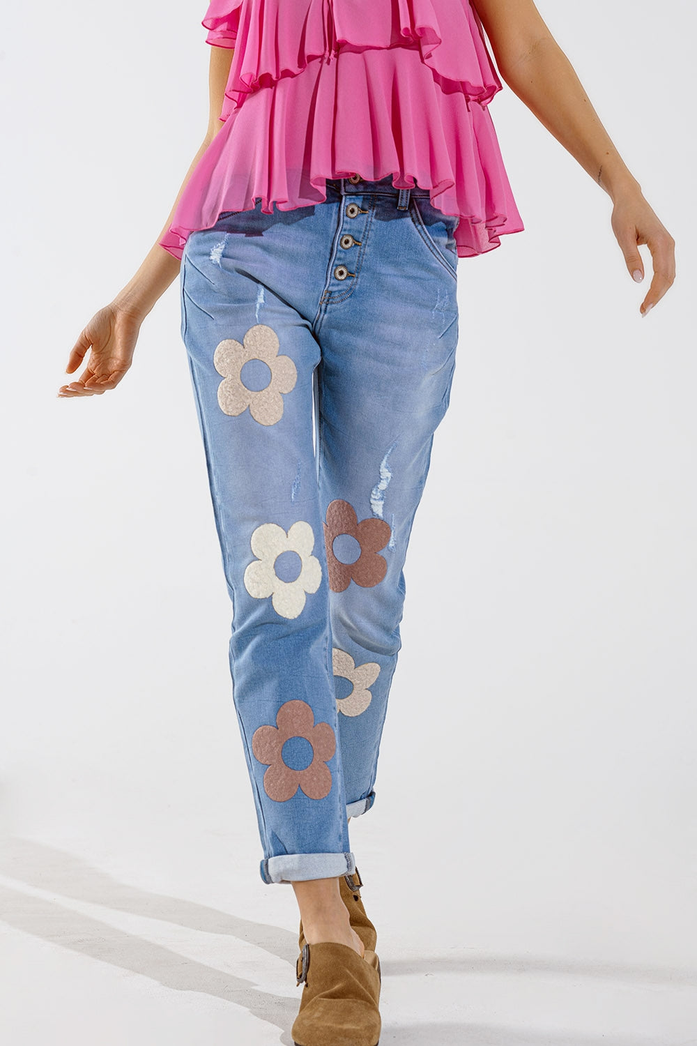 Vaqueros rectos con cierre de botones y detalle de flores en la parte delantera